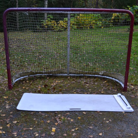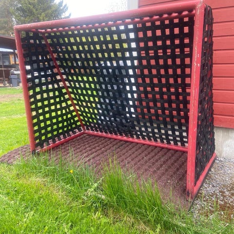 Vähän kolhuja saanut jääkiekkomaali,verkko uusittu,laukaisualusta Acon 46x46 yhteen liitettävät 22kpl.Pesua vaille ei erkan jälkiä vaan syksyn lehdet jättänyt jälkensä.Uudet 15e.kpl.Maalivahti ei oo ollu kokoonpanossa,uusi,kiinnitys kumirenkaat mukana.Kuvassa se ei ole kiinnitettynä.
