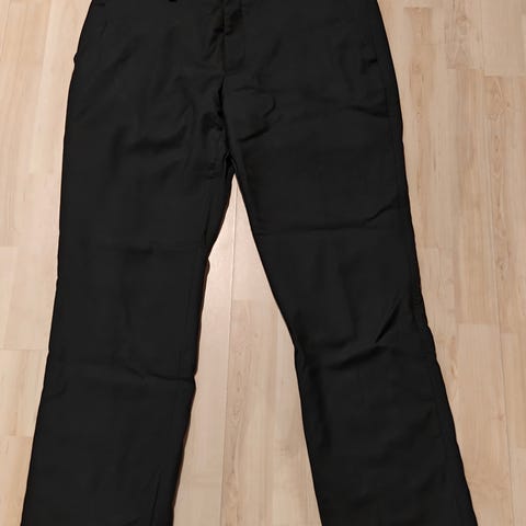 Juhlavan mustat puvunhousut, Dressmann, kangas laadukasta villasekoitetta (villa 45%), upean sileä pinta. Väri musta, valokuvissa kattolamput heijastavat pinnasta ja vaalentavat väriä. Koko vyötärö 34 pituus 32, lahkeen pituus yyötäröstä noin 105-106 cm, sopii normaalille ruumiinrakenteelle. Kunto erinomainen, käytetty vain juhlissa kolme kertaa vuodessa. Kuvassa päällä 184 cm/80 kg miehellä. Myyn laihtumisen vuoksi, olleet minulle noin 88-89 kiloisena päälle sopiva, nyt minulle liian suuret /kokoni tippunut pari numeroa). Hinta vain 15 euroa. Nouto Helsingistä myyjän osoitteesta tai Toridiili. Myynnissä myös miesten musta pikkutakki Dressmann koko 54 normaali.