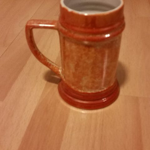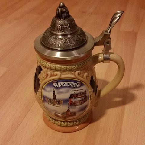 Oluttuoppi/olutmuki, jossa on kansi ja koristeellinen kuvio. Muki on valmistettu keraamisesta materiaalista ja siinä on metallinen kansi. Soveltuu juomien tarjoiluun ja keräilyesineeksi.