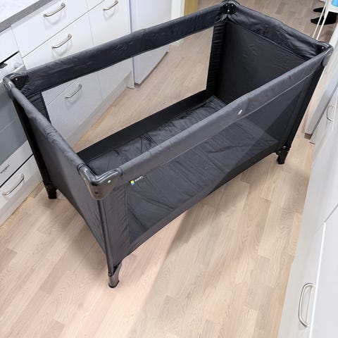 Matkasänky 120x60 cm, sänkyyn sopiva patja, täkki, pussilakana, tyyny sekä tyynliina.