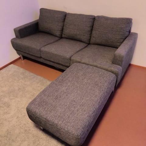 Myydään kuvan sohva ja rahi. Kyseessä Maskun Debby-sohva ja saman mallin rahi luonnonvaalealla teddy-kankaalla ja mustilla jaloilla.
