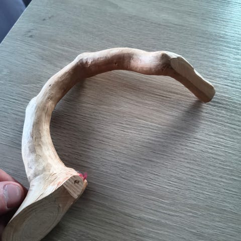 Käyttämätön puinen ovenkahva - kokonaispituus 23 cm. Kiinnitysreikien väli 24,4cm.