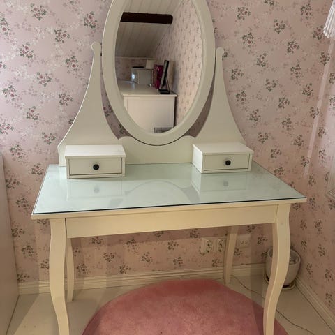 Kaunis, valkoinen kampauspöytä. Käytönjälkiä löytyy, mutta pääosin laatikoiden sisältä.