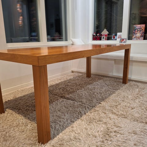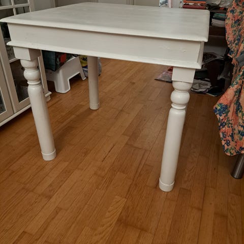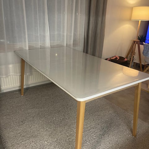 Pöytä on hyväkuntoinen, reunoissa ja pinnoissa pientä käytön jälkeä, mutta yleisilme siisti. Sopii moderniin, minimalistiseen tai skandinaaviseen sisustukseen.