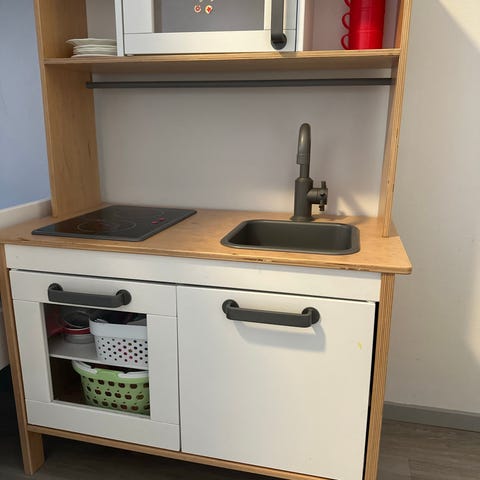 Lasten leikkikeittiö ihan hyvässä kunnossa tarroista vähän jälkiä ja pari tarraa kiinni saa varmasti putsattua.mukaan tarvikkeita