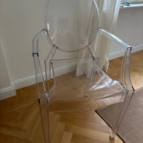 Myynnissä musta Louis Ghost -tuoli. Muotoilija Philippe Starckin vuonna 2002 suunnittelema ikoninen tuoli on kestävä ja miellyttävä istua.