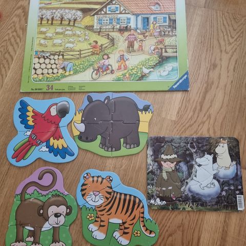 5 palapeliä, 6-40 palaa. Kaikki palat kaikissa tallella. Muumit kärsineimpiä, paloja vähän teipattu. Viat näkyy kuvissa.