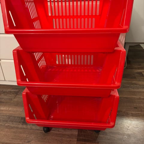 Valkoinen säilytyslokerikko vaikka leluille tai vaatteille. Alla pyörät. Korkeus 76 cm, leveys 46 cm, syvyys 35 cm.