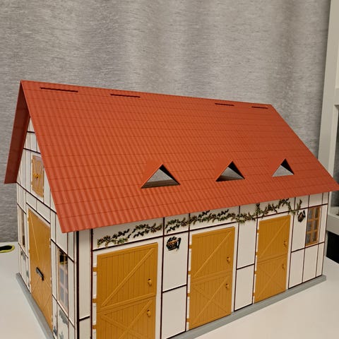 Myydään punainen hevostalli. Pituus 44cm, leveys 26cm. Mukana tikkaat, aita ja irroitettavat kattopalat (näkyy kuvassa). Hyväkuntoinen. Voin postittaa.