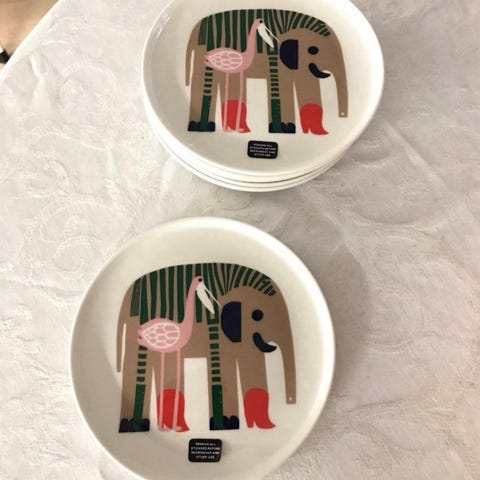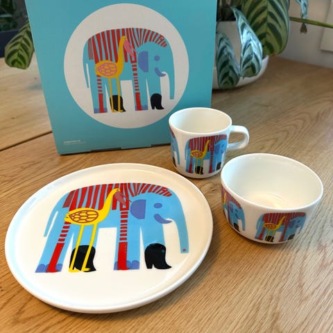 Myydään Marimekon Karkuteillä lastenastiasto, johon kuuluu muki, kulho ja lautanen.