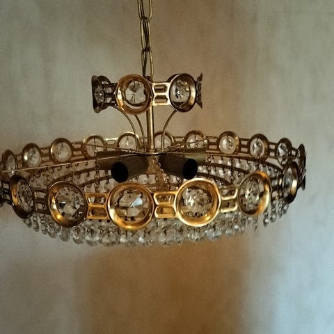 Riippuvalaisin, jossa musta runko ja kristallikoristeet. Sopii sisäkäyttöön, esimerkiksi keittiöön tai ruokailutilaan. Valaisin on varustettu useilla valonlähteillä ja se korkeuden katosta voi säätää. Ostettu aikanaan Sokos Tampere.