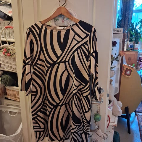 Kiva materiaali joka joustaa hieman ja laskeutuu kauniisti. Mitat noin, kainalo kainalo 51 cm, olka helma 70 cm