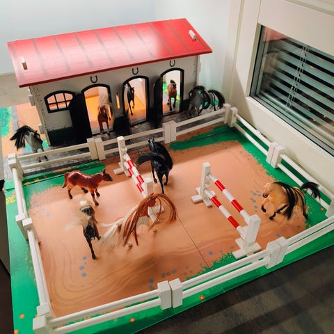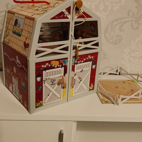 Hevostalli johon kuuluu 2 estettä, 10 aitaa. Kaikki näkyy kuvissa. Alusta on laitettu kontaktimuovilla kiinni. Alustan koko 75*59cm