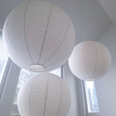 Pyöreä valaisinvarjostin. Valmistettu vaaleasta kankaasta ja sisäpuolelta tukimateriaalista. Varjostin on tarkoitettu kattovalaisimeen tai lattiavalaisimeen. Sen rakenne sisältää tukirakenteen varjostimen sisällä. Varjostin on teetetty valaisinliikkeessä. Halkaisija yläosassa 40cm ja alaosassa 50 cm. Korkeus 37cm.