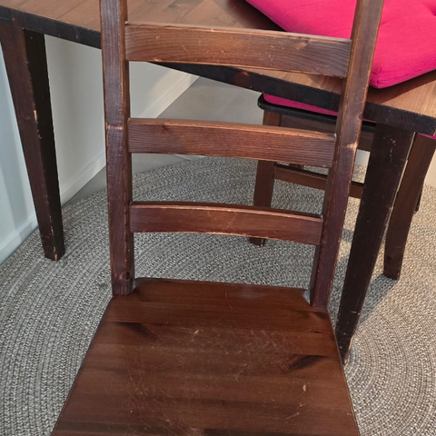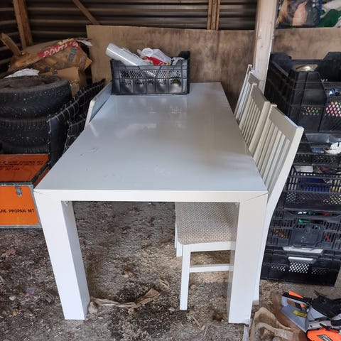 Askosta -21 ostettu ruokailuryhmä, johon kuuluu pöytä (l 90 cm, k 75 cm, p 90 cm) ja 4 tuolia (l 48 cm, s 55 cm, k 80 cm, istuinkorkeus 46 cm).