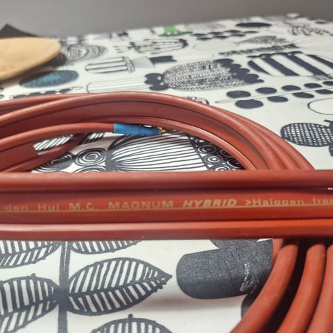 Myydään hyväkuntoinen 5m magnum hybrid kaapelipari. Mukaan 50cm pätkä jumpperien tekemiseen. Molemmissa päissä järeät haarukkaliittimet.