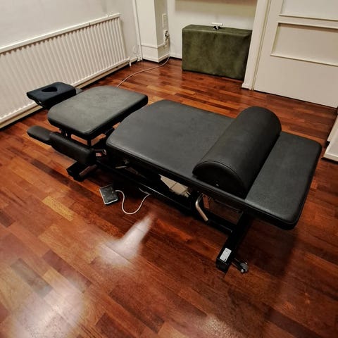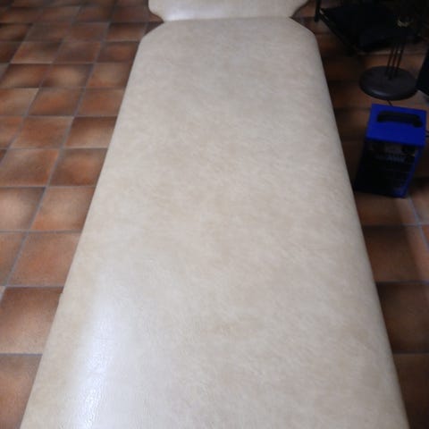 Kuvan hierontapöytä, hyvin toimivalla moottorilla, mutta kuvassa moottorin kiinnitysosa katkesi. Se on helppo korjata hitsaamalla. Epoksiliima ei auttanut).