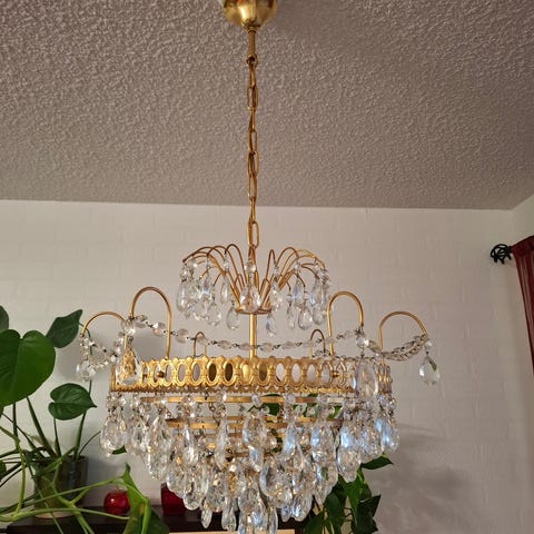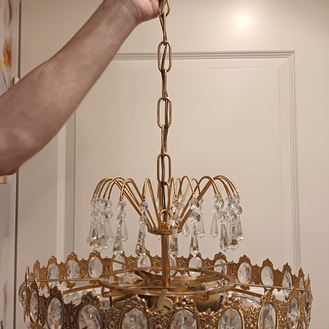 Lival kristalli-/ kattokruunu, halkaisija 42cm. Täysin toimiva ja kaikki kristallit paikallaan. Viisi polttimopaikkaa ja pitkä ketju, eli korkeutta voi säätää, tällä hetkellä koko korkeus katosta kruunun alapintaan n. 105 cm.