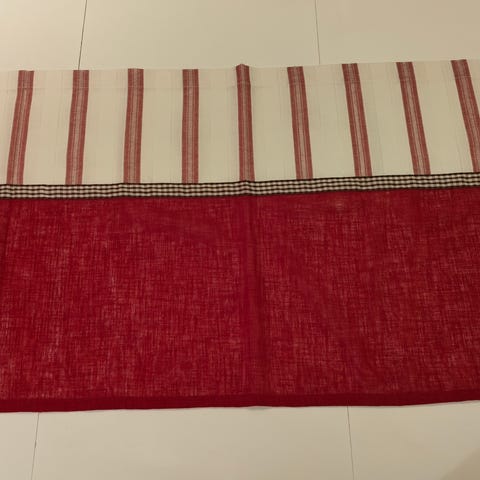 Pikkuruiseen ikkunaan tehty kappaverho, kiinnitys klipsuilla. Koko 51x150cm.