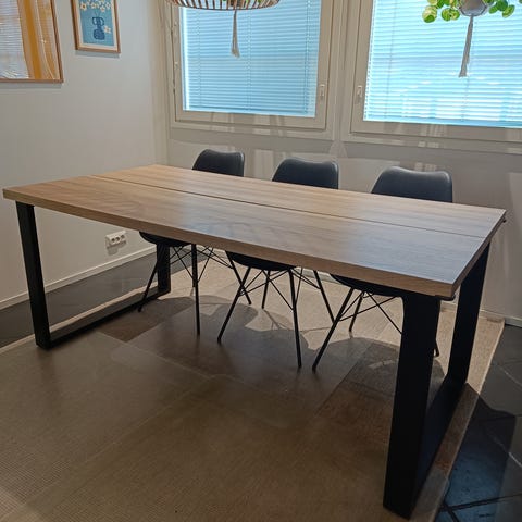 Vuoden vanha ruokapöytä. Asko Colima, mitat 100x210. Pöytä on valmistettu melamiinista, joka on helppohoitoinen materiaali. L 100 cm K 75 cm P 210 cm