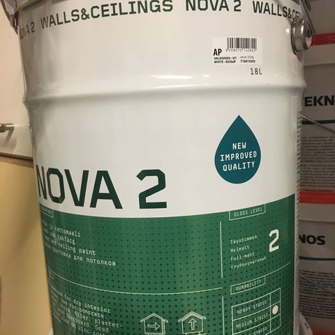 Nova 2 on vesiohenteinen, liuotteeton, täyshimmeä dispersiomaali ammattimaiseen pohjamaalaukseen ja kattojen maalaukseen.