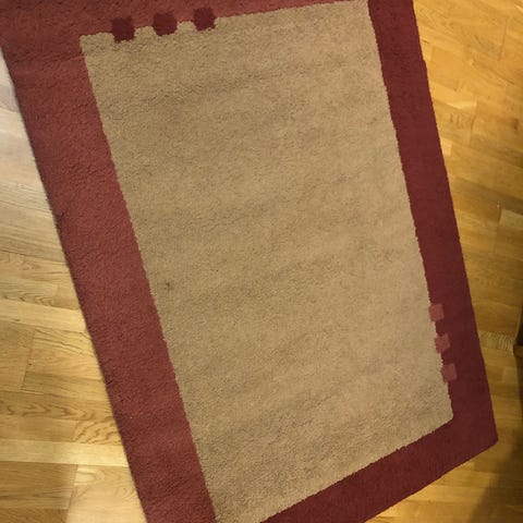 160 x 230 cm vaalea karvamatto. Matosta löytyy tummahkoja tahrakohtia, mutta muita näkyvämpiä tahroja ei ole. Suuremman maton mukana saa myös samanlaisen, pienemmän 60 x 120 cm maton.