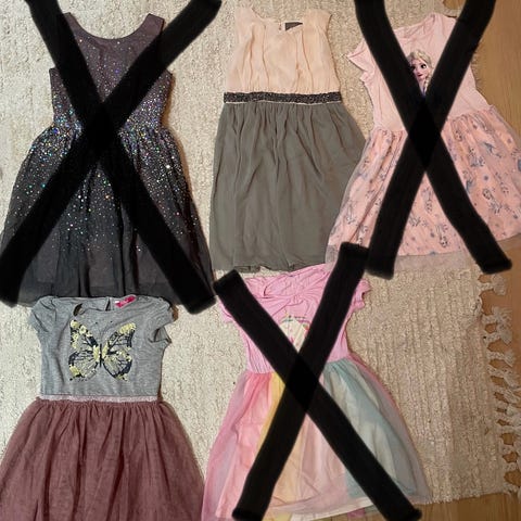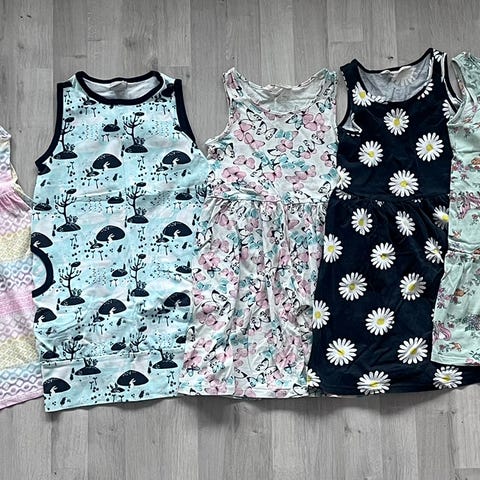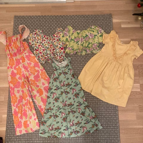 Mekkopaketti sisältää sinivalkoisen raidallisen mekon ja kaksi keltaista kukallista mekkoa. Kaikkien koko 122/128.