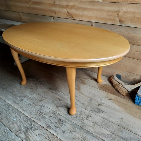 Pöytä on siisti. Hieman siintää pöydällä olleen pikkuliinan aiheuttama väriero. Pöydän hinta 32 euroa ja sijaitsee Liedossa.