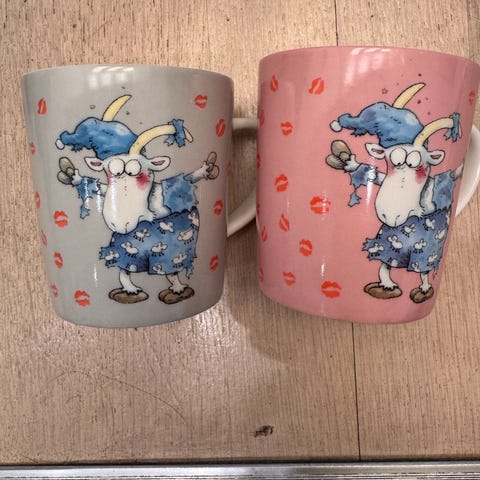Jenna Kunnaksen suunnittelemat hauskat mukit. Halkaisija 9 cm, korkeus 9 cm. 3 kpl yhteensä 6€. Vain käteiskauppa