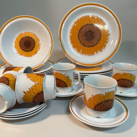 70-luvulta nostalgiset Egersund Unique astiat: teepannu (tilavuus 1 L), 2 kpl teekuppeja (tilavuus 3 dl), teekuppien aluslautaset (halkaisija 16 cm), leipälautaset (halkaisija 20 cm), 3 kpl syviä lautasia (halkaisija 20 cm), 1 kpl matala lautanen (halkaisija 25 cm), uunivuoka (koko 30x23 cm) . Hyväkuntoiset, naarmuttomat, uudenveroiset. Hinta koko setille. Nouto tai postit lisätään hintaan.