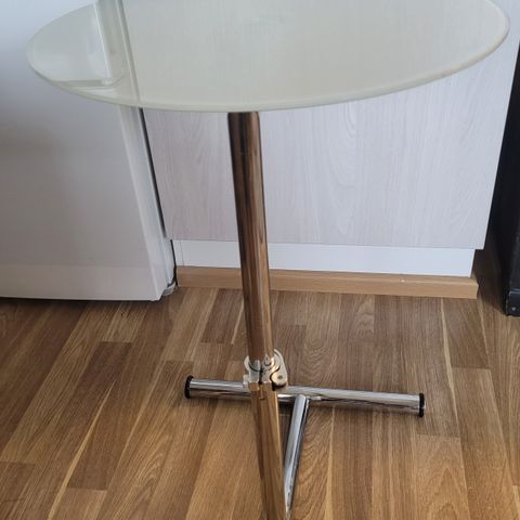 Valkoinen pyöreä sohvapöytä metallijaloilla. Käytönjälkeä löytyy ja muutama pikku naarmu pöydän kannessa mutta yleisilme siisti.