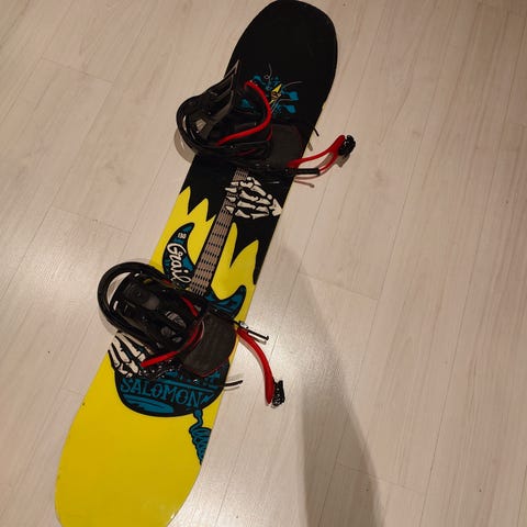 Kaupan päälle Salomonin lumilautakengät, koko 44, joten saat valmiin setin rinteeseen.