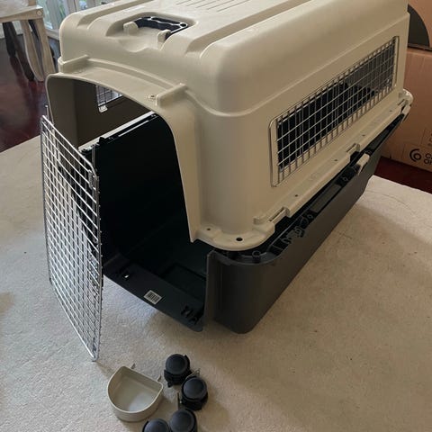 Yhdellä lennolla ollut koiran kuljetuslaatikoo. Säilytetty lämpimässä. Koko leveys 60, korkeus 66, pituus 86. Juomapullo ja ruokakupit mukana.