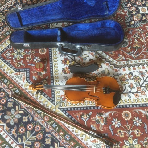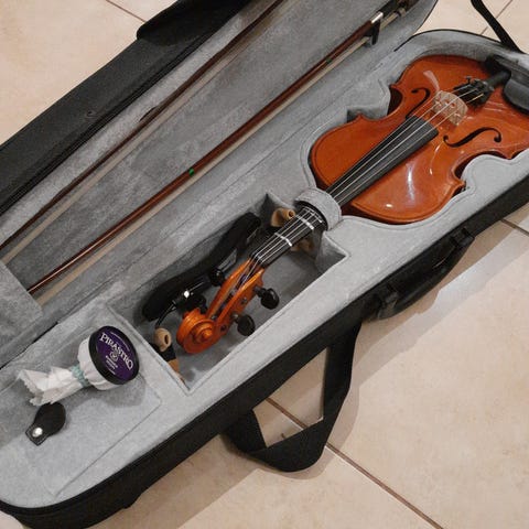 Ruskea puinen viulu, mukana jousi ja suojakotelo, olkatuki. Sopii soittoharjoitteluun ja esiintymiseen. Antonius stratovarius cremonensis.