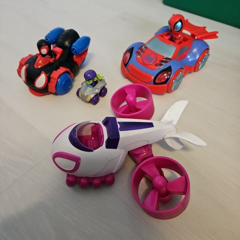 Spidey and his Amazing Friends hahmot, sisältää Spidey + auto ja Ghost Spider + moottoripyörä. Leikitty vain vähän. Hahmon korkeus n. 10 cm.