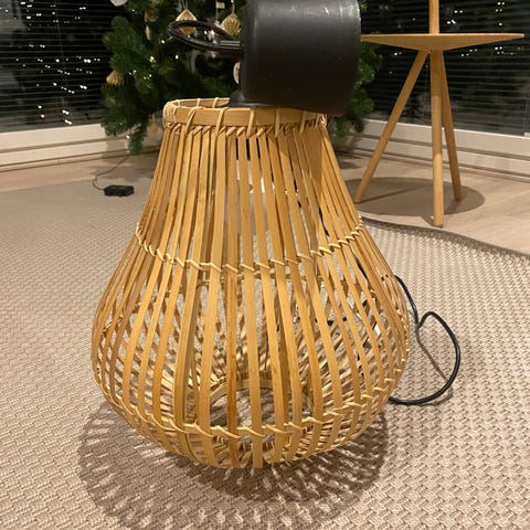 Myydään kuvan kattovalaisimen varjostin. Korkeus 40cm, alareunan halkaisija 42cm.