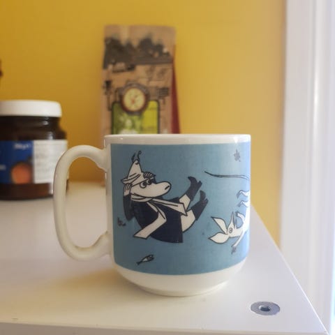 Ostin tämän mukin ysärillä ja pistin vitriiniin. Muki ei ole ollut käytössä, vaan koristeena, ks. viimeinen kuva pohjasta.