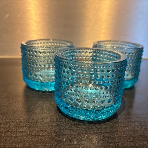 Iittala Kastehelmi tuikkukipot, 2 kappaletta, tumman sininen lasi. Tuikkukipot on valmistettu lasista ja niissä on koristeellinen pisarakuviointi.