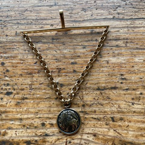 Käyttämätön pronssinen solmioneula rasioineen ja papereineen.