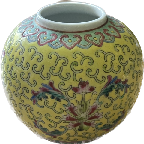 Kiinalainen inkivääripurkki kukkakuvioilla. Kansi puuttuu. Purkin korkeus noin 6cm.