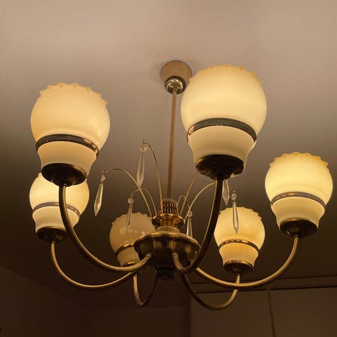 Messinkinen kattokruunu, jossa 5 valkoista lasikupua. Käytetty, mutta erittäin hyväkuntoinen ja ehjä. Klassinen malli. Leveys n. 60 cm ja korkeus 62 cm.