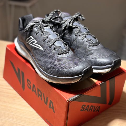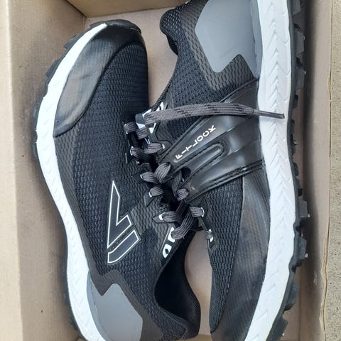 Torista ostetut, itselle liian pieneksi todetut nastajuoksukengät. Nastat tallella ja kengät kaikin puolin ehjät.