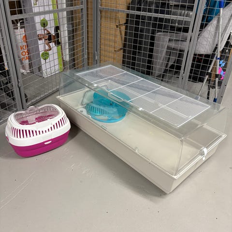 Koti pienelle jyrsijälle.Antiikkilipastoon maalattu/verkotettu/lukittu kolmiosainen huoneisto kahdessa kerroksessa lemmikki hamsterille/hiirelle. Valkoinen