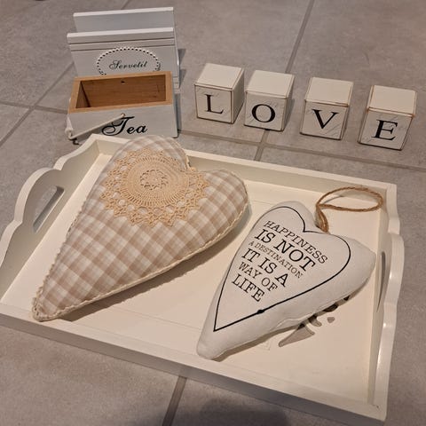 Kaunis ja harmoninen 12 osan koriste- ja askartelukokonaisuus romanttiseen kotiin, lahjaksi tai luoviin projekteihin. Kokonaisuus sisältää useita eri materiaaleja ja tunnelmia yhdistäviä esineitä, kuten englantilaisen vintage Grossmith pahvirasian, Sarah Kay -aiheisen kehystetyn kortin, sydämenmuotoisia koriste-esineitä, lintuhäkkikoristeen vaaleanpunaisilla linnuilla, Singer-ompelukoneen suomenkielisen ohjeen sekä erilaisia sisustus- ja askartelutarvikkeita.