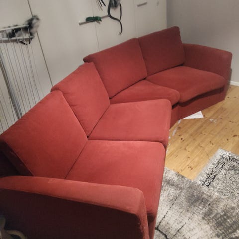 Myydään kuvan keinonahkainen kulmasohva rahilla. Pientä kulumaa parissa kohdassa. Käsintyötä ja uniikkiyksilö.