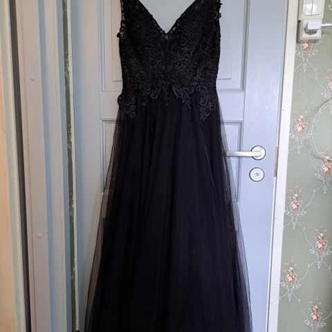 Kauniin punainen, olkaimeton, koko 38. Myötäilee kauniisti vartaloa. Mukaan samaa kangasta oleva hartiahuivi.