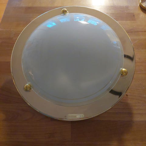 Toimiva iso plafondi kattoon. Mitat k 13-14 cm, diam 60 cm. Kupu on muovia. Kanta jossa valopisteet (4 kpl) on metallia, nuppi rosteria. Max 4x40W. E14 kanta. Ei sisällä lamppuja.