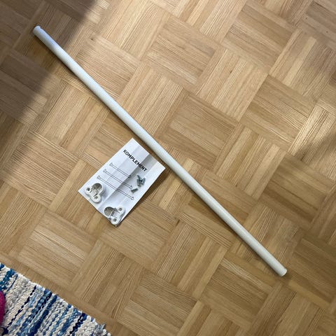 Ikean Komplement vaatetanko 50 cm leveään Pax vaatekaappiin. Vaatetanko kiinnitetään kaapin peräosan hyllyn reikiin ja sen pituus on 35 cm. Tämä versio poistunut jo Ikean myynnistä. Avaamaton pakkaus.