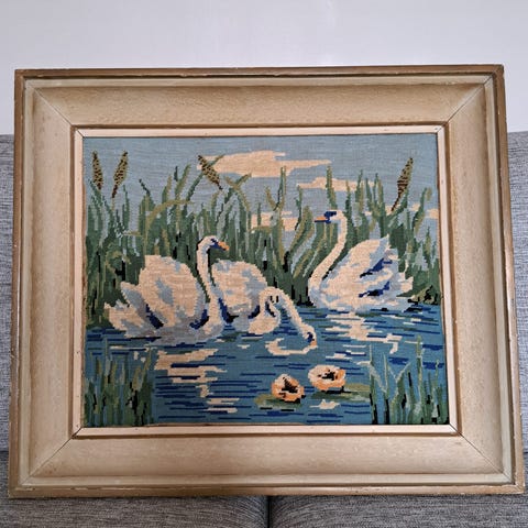 Myydään pois aivan ihana joutsen ristipistotaulu kultakehyksellä. Koko 59x49 cm