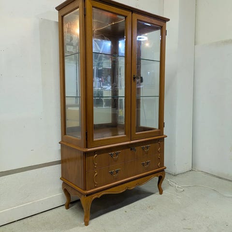 Kaunis ja normaalista poikkeava Rokokoo tyylin kulmavitriini myytävänä. Yleiskunto hyvä. Yläosa pois nostettava. Avaimet tallessa. Lukot vaihdettu. Toisen lukon salpa liikkuu hyvin vähän, mutta toimii. Toisen avain ei poistu lukosta kun lukko on avattu. Koristeet ehjiä. Rakenne kaikin puolin tukeva. Ei hajuja.